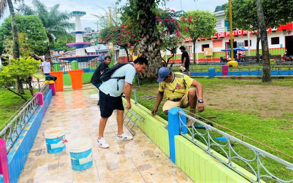 Trabajadores ediles realizan pintado y mantenimiento de la plaza de armas en Pinto Recodo por su 63 aniversario
