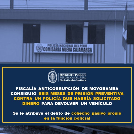 Fiscalía anticorrupción de Moyobamba consiguió seis meses de prisión preventiva para policía que habría solicitado dinero para devolver un vehículo