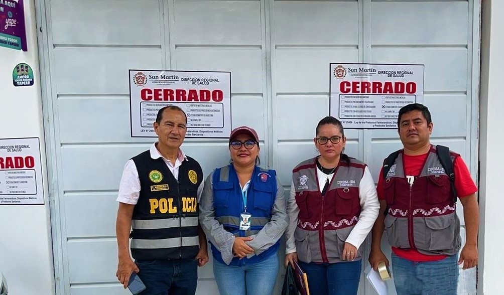Durante un operativo conjunto, la Dirección Regional de Salud (Diresa) San Martín y el Departamento de Investigación Criminal (Depincri) de la PNP, cerraron la botica Miloy, ubicada en Jr. Comandante Chirinos N°101 en el distrito de Morales, provincia de San Martin, tras constatar que, no contaba con la autorización sanitaria de funcionamiento otorgado por la Dirección de Regulación y Fiscalización Sectorial de Salud (Direfissa) de la Diresa San Martín.