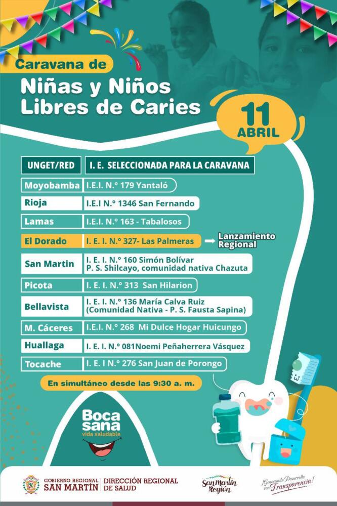 El viernes 11 de abril -en conmemoración al Día Nacional de la Promoción y Protección Bucal Infantil que se celebra el 12 de abril de cada año-, se realizará la Caravana de Niños y Niñas Libres de Caries -de manera simultánea desde las 9:30 a.m.– en instituciones educativas seleccionadas, ubicadas en las 10 provincias.