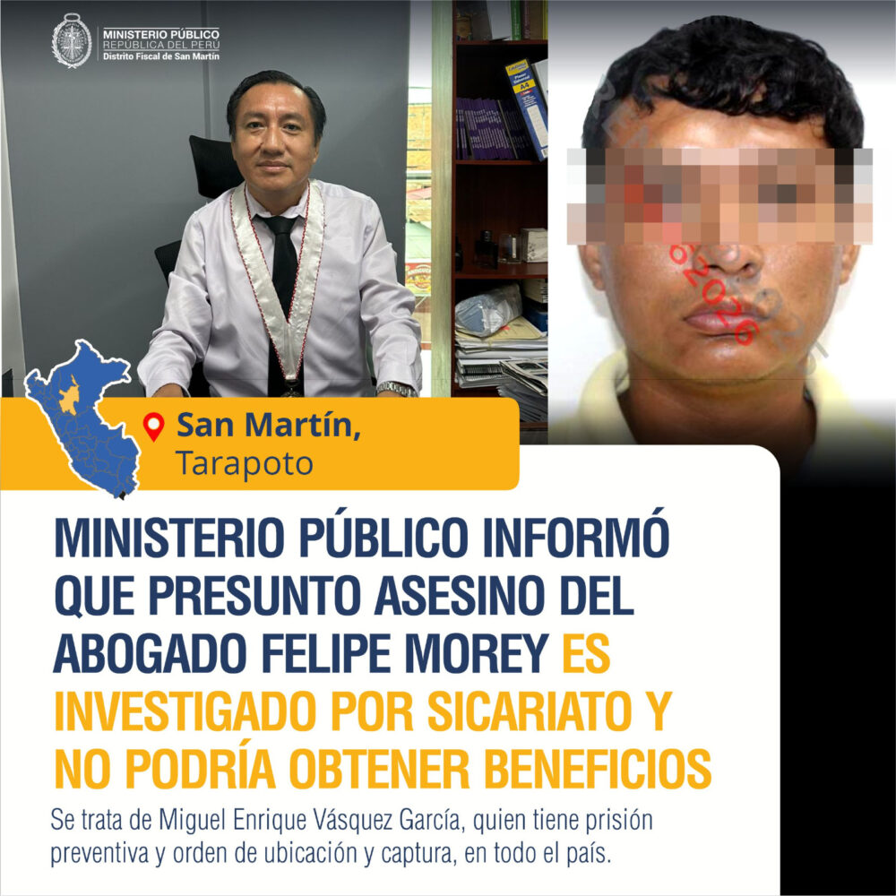 El Ministerio Público informó a la ciudadanía que, tras la confesión de Miguel Enrique Vásquez García, conocido con el alias de Gatillero, quien se atribuye la autoría del crimen del abogado Luis Felipe Morey Riva, es investigado por el delito de sicariato y, de acuerdo a ley, no podría obtener beneficios penitenciarios.